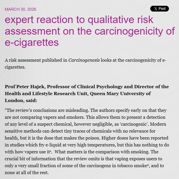 Diversas instituciones de referencia han respaldado esta visión, destacando el papel potencial de los cigarrillos electrónicos como herramienta de reducción de daños y apoyo al abandono del tabaquismo, así como la ausencia de evidencia sólida que relacione la nicotina, de forma aislada, con el desarrollo de cáncer.